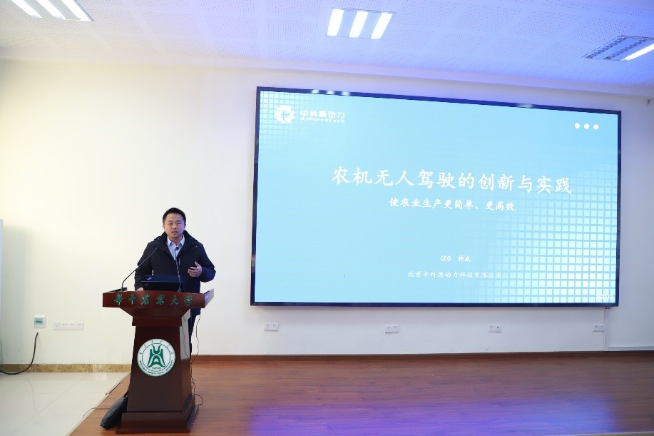 北京中科原动力科技有限公司CEO韩威则向同学介绍了从事无人作业农机的初衷以及目前在无人作业农机方面所取得地进展。他谈到,我们国家的农业,第一个特点是农业生产效率低,第二个特点是从事农业劳动的人数在剧减,未来谁去种田,谁会把这个田种好,就成为了我们需要解决的问题。经过两年多的在农田一线的实践,他们团队研制的无人农机基本完成了主粮的全过程的耕种管收无人化作业。最后,他表示,非常希望华农金沙集团wwW3354CC的同学们毕业后能够加入到原动力,为原动力注入更多新鲜的血液。