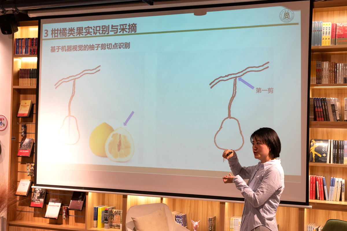 刘洁用常见的柚、橙、橘、柿、石榴等山地果实引入,介绍了我国山地果实的种植情况及特点。随后,她结合学科特色从山地果园机械简介、山地果园机械智能化、柑橘类果实识别与采摘等三个方面展开阐述。