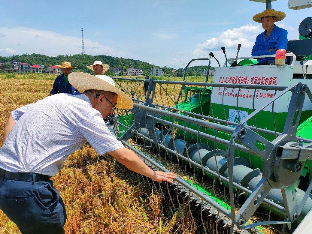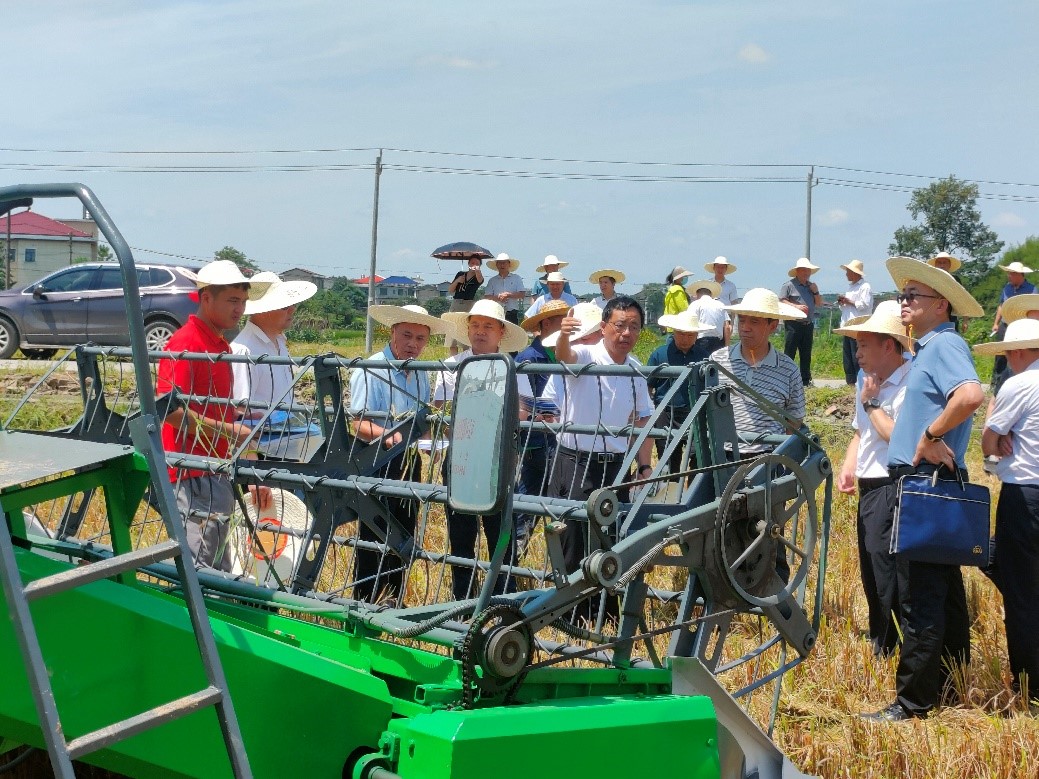 在调研现场,宋建武认真观看再生稻收获机田间作业情况,并详细询问了再生稻种植及收获机作业的特点,对再生稻收获机高效低损的作业性能表示肯定。
