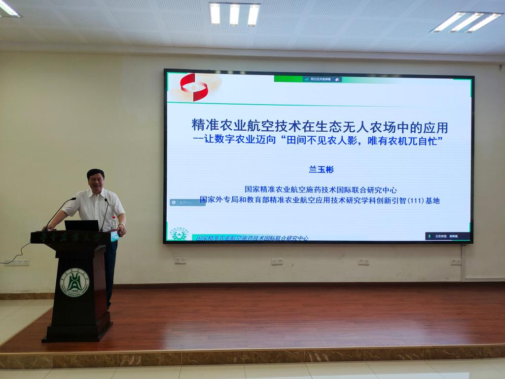 报告最后,兰教授对植保无人机在生态农场中的应用进行了介绍,他谈到,生态无人农场或将成为引领未来的农业模式,希望更多同学能将自己所学的专业知识应用到国家的农业发展中,推动建设绿色低碳、高效环保的生态农场。