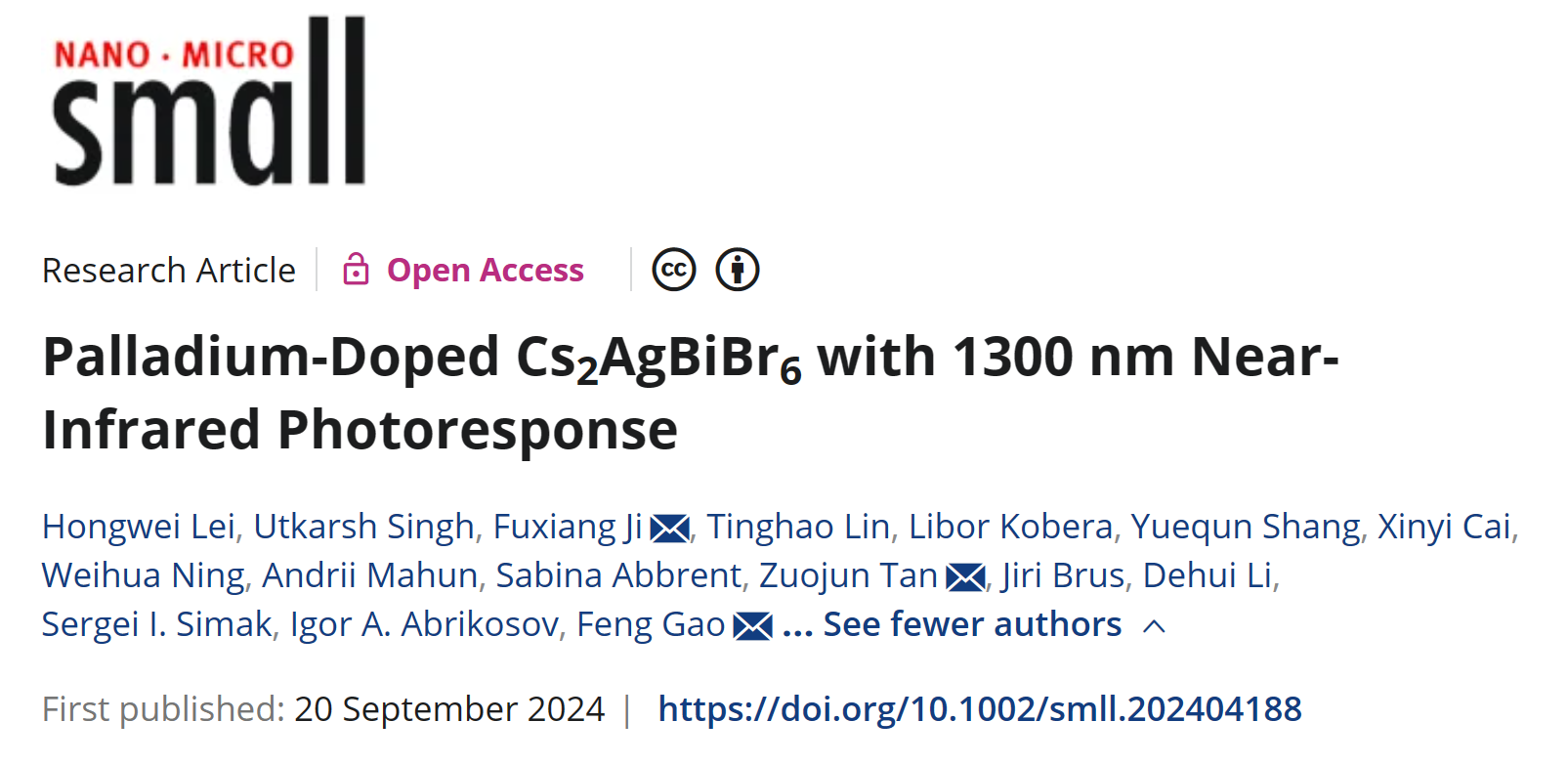 南湖新闻网讯(通讯员 雷红伟)近日,我校金沙集团wwW3354CC光机电共性技术与装备团队研发出一种基于钯(Pd)掺杂的铯银铋溴(Cs₂AgBiBr₆)无铅钙钛矿的红外光电探测器,相关研究成果以“Palladium-Doped Cs2AgBiBr6 with 1300 nm Near-Infrared Photoresponse”为题在Small期刊上在线发表。