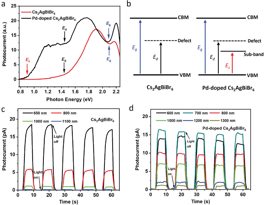 针对上述问题,研究人员选取制备简单、低成本、无毒、稳定的卤化物双钙钛矿Cs₂AgBiBr₆为主体,创新性地在禁带宽度相对较宽的(2.0 eV)Cs₂AgBiBr₆中掺入微量的钯(Pd)元素,将其光吸收谱的截止边从570 nm大幅拓宽至约1400 nm,这是目前报道的Cs₂AgBiBr₆以及窄带隙铅基或无铅钙钛矿材料中最宽的吸收范围。系统性的实验研究以及第一性原理计算表明,Pd²⁺离子成功掺入到了主晶格中并部分取代了Ag⁺。研究发现,Pd掺杂不会对主体材料的禁带宽度和晶格参数产生明显影响,掺杂剂的Pd(d)轨道态在主带隙即价带和导带之间形成了子带隙中间能级,这些子带隙位于距离价带约0.9 eV的位置,显著拓宽了Cs₂AgBiBr₆的吸收范围。在扩展光吸收后,研究人员进一步制造了单晶近红外(NIR)光电探测器,发现引入子带隙中间能级后,掺Pd的Cs₂AgBiBr₆在亚带隙态即能量小于2.0 eV的光激发下也可以实现光载流子的生成,单晶探测器的光响应区域可以扩展至1300 nm,这也是目前报道的铅基和无铅钙钛矿材料中最宽的光响应区域。该研究证实了子带隙在拓宽卤化物双钙钛矿吸收和光响应方面的有效性,为利用掺杂来调控半导体光电特性以及基于较宽禁带宽度半导体制备红外探测器提供了新思路。