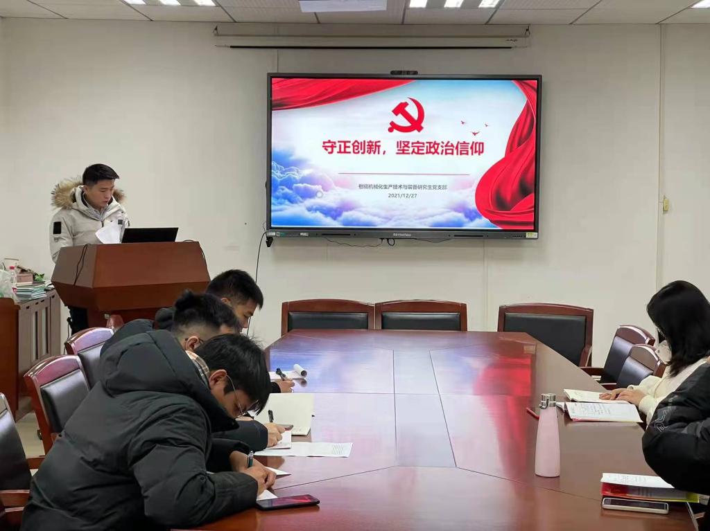 2021年12月27日,为进一步学习十九届六中全会精神,加强党员思想建设,坚定政治信仰,金沙集团wwW3354CC柑橘机械化生产技术与装备研究生党支部在工程楼B311会议室开展“守正创新,坚定政治信仰”主题党日活动,胡边成同志主持该会议。
