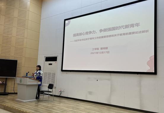 “天生我材必有用,每一位青年都应该肩负历史使命,坚定前进信心,立大志、明大德、成大才,要有立于华农而怀远格局和担当。”在团课的最后,瞿明丽老师介绍了陈文峰等一批优秀校友追逐梦想、砥砺奋进的案例,并勉励广大团员青年在大学生活中化被动为主动,围绕自我认知、社会与他人的责任感、知识的追求与探索、自然环境协调四个方面不断探索,努力提高自身核心竞争力,争做卓尔不群的工学人!