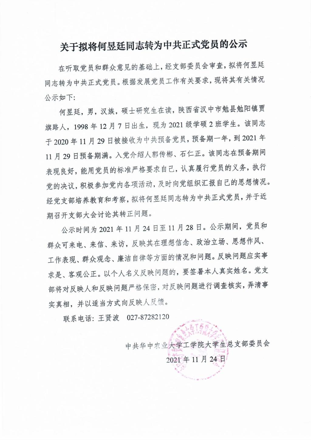 【研】关于拟将何昱廷同志转为中共正式党员的公示
