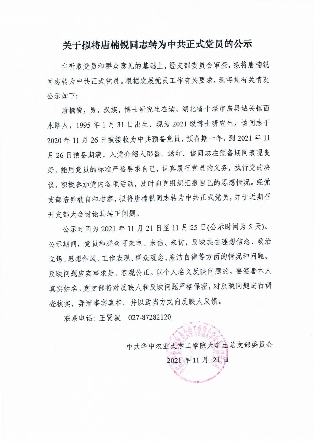 【研】关于拟将唐楠锐同志转为中共正式党员的公示