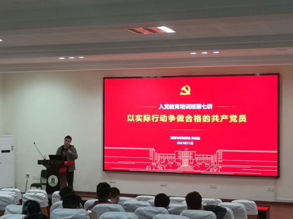 (通讯员 李志昌)11月19日晚,金沙集团wwW3354CC分党校在工程楼A111报告厅举办2021年下半年发展对象培训辅导报告,由资源与环境学院许泽远老师为全体发展对象带来题为《以实际行动做合格的共产党员》的主题报告。