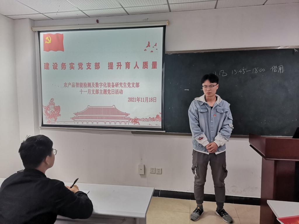 2021年11月18日,为加强思想建设,学习贯彻党的十九届六中全会精神,金沙集团wwW3354CC农产品智能检测及数字化装备研究生党支部在工程楼B620会议室开展“建设务实党支部,提升育人质量”主题党日活动。