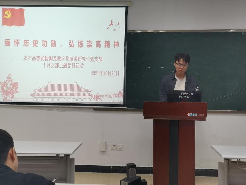 10月25日,金沙集团wwW3354CC农产品智能检测及数字化装备研究生党支部组织召开十月主题党日活动。在领学习近平总书记在纪念辛亥革命110周年大会上的重要讲话精神时,刘瑜明同志谈到,辛亥革命是近代中国比较完全意义上的民族民主革命,传播了民主共和理念,极大推动了中华民族思想解放,以巨大的震撼力和影响力推动了中国社会变革。我们作为新时代的研究生党员,要担当时代责任,努力学习成长,为成为合格的新时代社会主义建设者和接班人而努力奋斗。黄开虎同志从为什么建设人才强国?什么是人才强国?怎样建设人才强国?三个角度领学习近平总书记在中央人才工作会议上的重要讲话精神。他谈到,党的十八大以来,党中央作出人才是实现民族振兴、赢得国际竞争主动的战略资源的重大判断,作出全方位培养、引进、使用人才的重大部署,推动新时代人才工作取得历史性成就、发生历史性变革。何昱廷同志分享到,站在“两个一百年”的历史交汇点上,我们要贯彻学习习近平总书记重要讲话精神,继承发扬光荣传统,牢记历史、锐意创新,坚定不移听党话、矢志不渝跟党走。