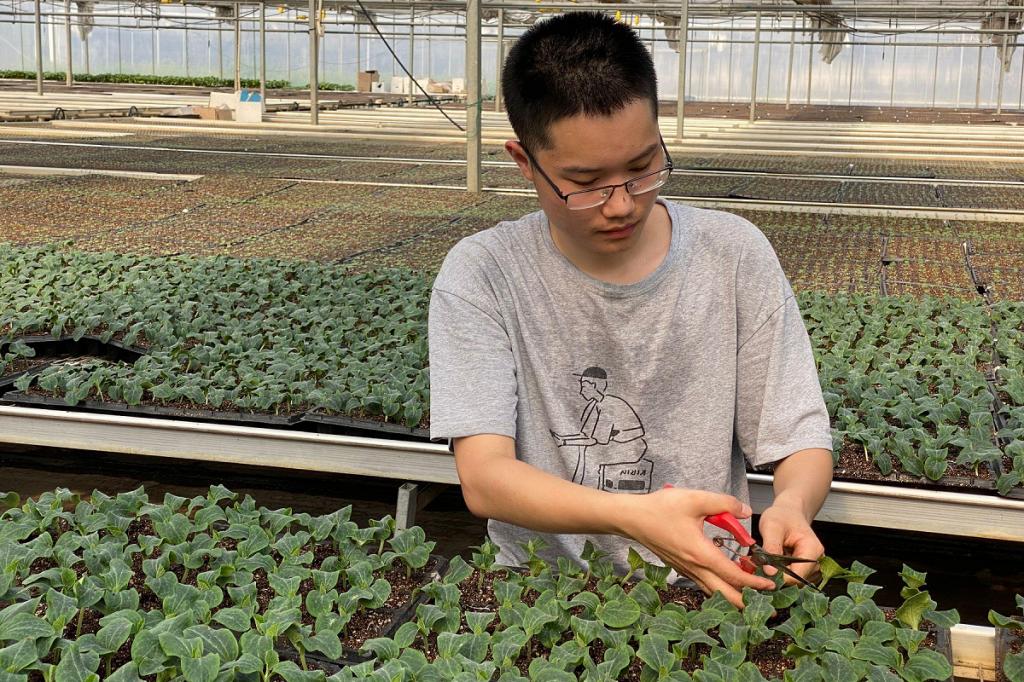 “将幼苗的叶子剪掉一半,主要是为了减少幼苗水分的散失,提高幼苗的存活率。”在基地负责人的指导下,大家开始尝试修建叶片并相互分享体会。成员彭派说:“修建叶片这项工作目前主要还是靠人工完成,一是因为叶片之间相互有遮盖,机器很难挑出个别枝叶,二是因为每片叶子的形状差别很大,且幼苗有种恢复原状的‘抵抗力’,因此很难把握好刀具相对于叶子的位置。”