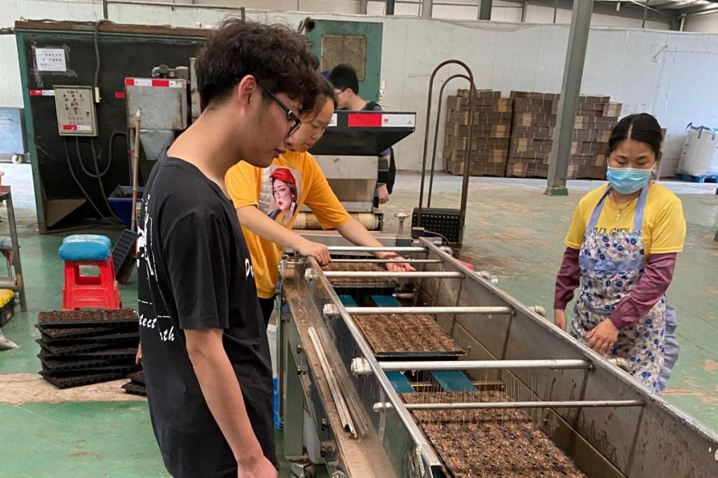 调研过程中,队员们亲手体验了播种、修理叶片、嫁接等操作过程。“模具填土、挖种坑、放种子、盖土、浇水”,在手工播种完成后队员陈杰说:“放种子是手工操作中效率最低的步骤。种子质量轻,易与手指粘连,常常需要用力才能脱落,大大延长了工作时长。手工播种虽操作简单,但生产效率非常低,在现代化农业生产中使用十分受限。”随后在现场工作人员的指导下,实践团成员们开始使用自动播种装置播种。只需要轻轻操作播种设备,整个播种步骤均可自动进行,这让现场的队员们体验到了现代科技的力量。播种结束后,队员们利用所学专业知识,对机器的各个零部件进行剖析和研究,加深了对农业机械的了解。