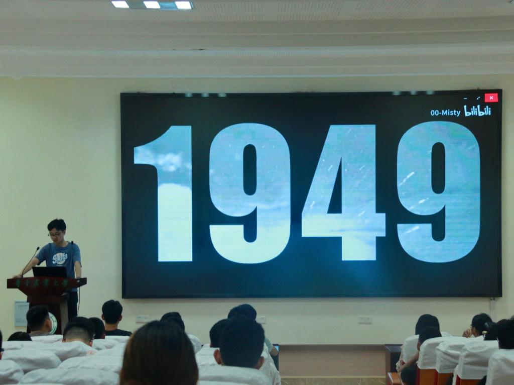 “万众一心,同舟共济,携手共进,谱写最美华章”。鲁晨阳、樊伟、李运通三人通过讲述中国共产党成立以来为民族、国家和人民所做的贡献,号召同学们永远跟党走。