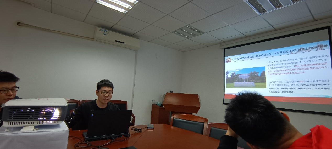 会议开始前,全体党员在组织委员刘婷婷带领下重温入党誓词,并按期缴纳了当月党费。党支部成员祝浩东同志带领大家学习了习近平总书记在中央党校(国家行政学院)中青干部培训班开班式上的讲话精神,他提到习近平新时代中国特色社会主义思想是马克思主义中国化的最新成果,集中体现了马克思主义的理论品格和精神实质,闪耀着马克思主义的真理光辉,是当今时代最现实、最鲜活的马克思主义,作为研究生党员,我们应该积极响应并认真学习。祝浩东同时还向支部成员介绍了《华中农业大学庆祝中国共产党成立100周年活动实施方案》以及《华中农业大学党史学习教育实施方案》,祝浩东同志认为学校丰富多彩的党史学习活动为我们进一步学习党史提供了一个大的平台与契机。