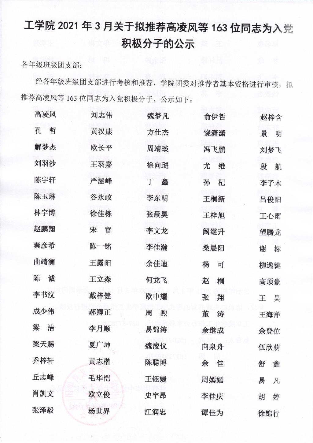 金沙集团wwW3354CC2021年3月关于拟推荐高凌风等163位同志为入党积极分子的公示