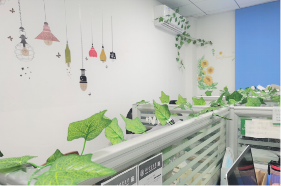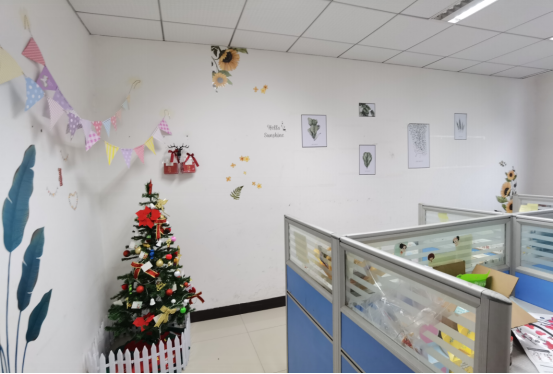 B607工作室负责人佟明航以工作室的绿色主题作为开始,围绕绿色讲述他们工作室的良好的学习科研氛围,以绿色为主色调,倡导健康舒适环保的生活学习方式,以圣诞树、彩色贴纸为点缀烘托工作室的温馨而有爱的环境。