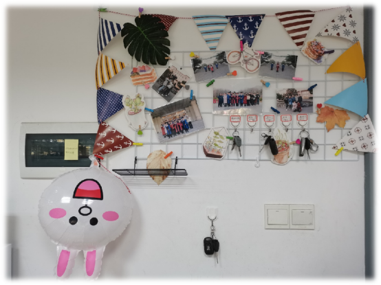 B505工作室负责人袁涛用工作室成员手绘的“梅兰竹菊”向大家展示工作室成员的高尚情操和艺术氛围,用门把手上的针织猫爪和照片墙彰显工作室的人文关怀。