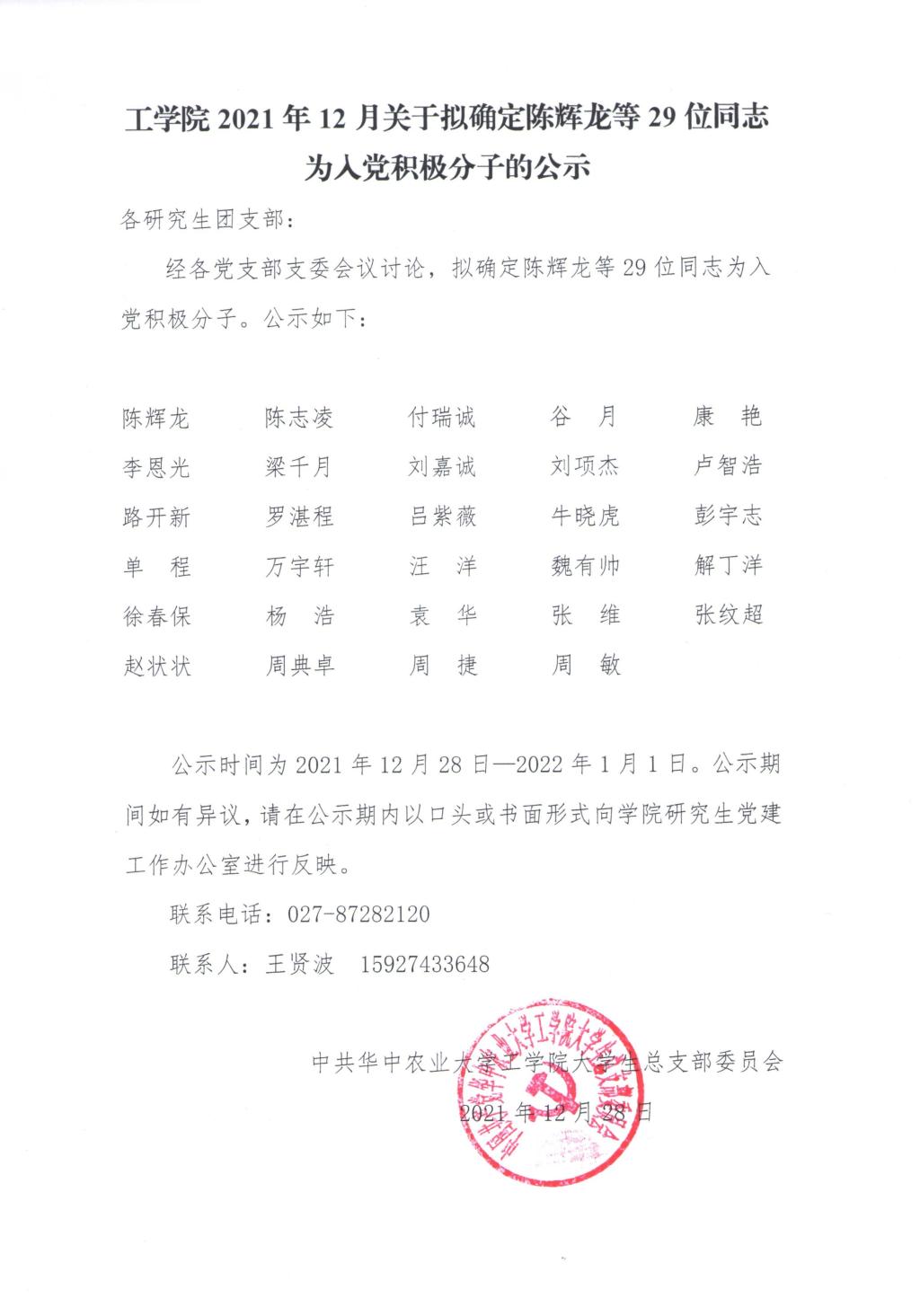 【研】金沙集团wwW3354CC2021年12月关于拟确定陈辉龙等29位同志为入党积极分子的公示