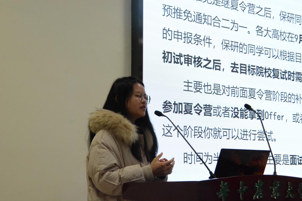 细节决定成败。在分享自己保研经验时,安璇重点介绍了准备阶段中简历制作的种种细节。安璇说道:“我们在制作简历的过程中,需要从基础信息、学习成绩、科研经历、比赛获奖等各个方面表现自己的优点,并且真实地写出自己的情况,以免面试时给自己带来麻烦;个人陈述阶段和简历制作相似但不完全相同,目的是用最精准的语言描述最优秀的自己;在联系导师的过程中,要有礼貌,态度真诚。”安璇通过介绍简历以及准备工作等等细节说明了保研准备工作的重要意义。