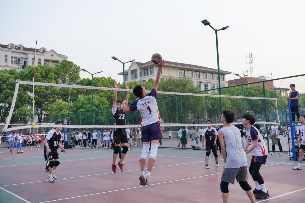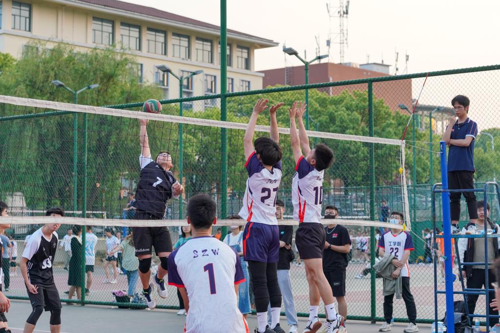 在我院男排与食科男排比赛之初,我院谭周石再次用自己强势的发球确立了八分的领先优势。为保存体力,双方都没有展现出很高的攻势。我院男排稳扎稳打,不骄不躁,逐渐得分,最终,工学男排25—8食科男排先下一城。第二局,杜俊老师提出建议,希望我院男排能够打的更加激情,更有活力一些,为淘汰赛做准备。于是,我院男排轮换了一些队员的同时刻意增加了三号位和二号位的进攻,我院男排的热情也激发了食科男排的斗志,食科男排对我方发起了多次有效进攻,场面来回拉扯不断,我院男排则愈战愈勇,廖彼得连续助飞雷宗霖扣球得分。最终工学男排25—19拿下了第二局比赛,我院男排以五战全胜的战绩晋级8强。