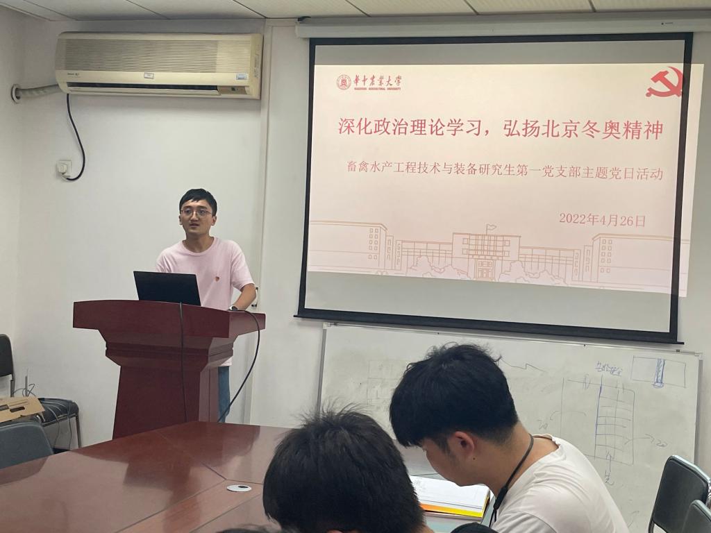 2022年4月26日晚,金沙集团wwW3354CC畜禽水产工程技术与装备研究生第一党支部在工程楼B422开展主题为“深化政治理论学习,弘扬北京冬奥精神”的主题党日活动。
