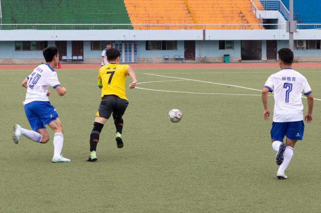 4月29日中午,2022“狮子山杯”足球赛(研究生)男足季军争夺赛激情开战。在东运动场足球场上,身穿黄色球衣的工信联队以2:1战胜身穿白色球衣的动科动医学院队,夺得季军。
