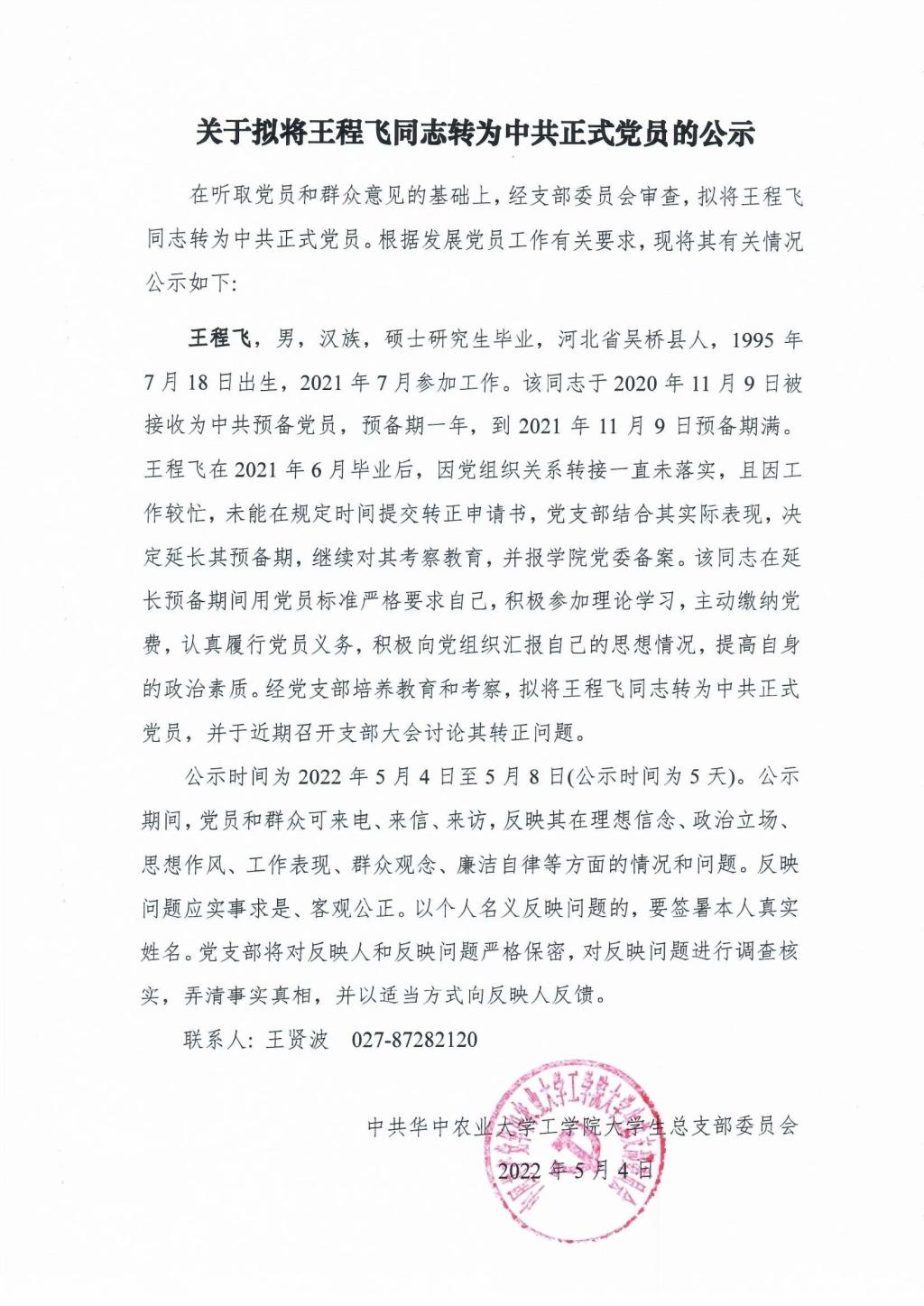 【研】关于拟将王程飞同志转为中共正式党员的公示