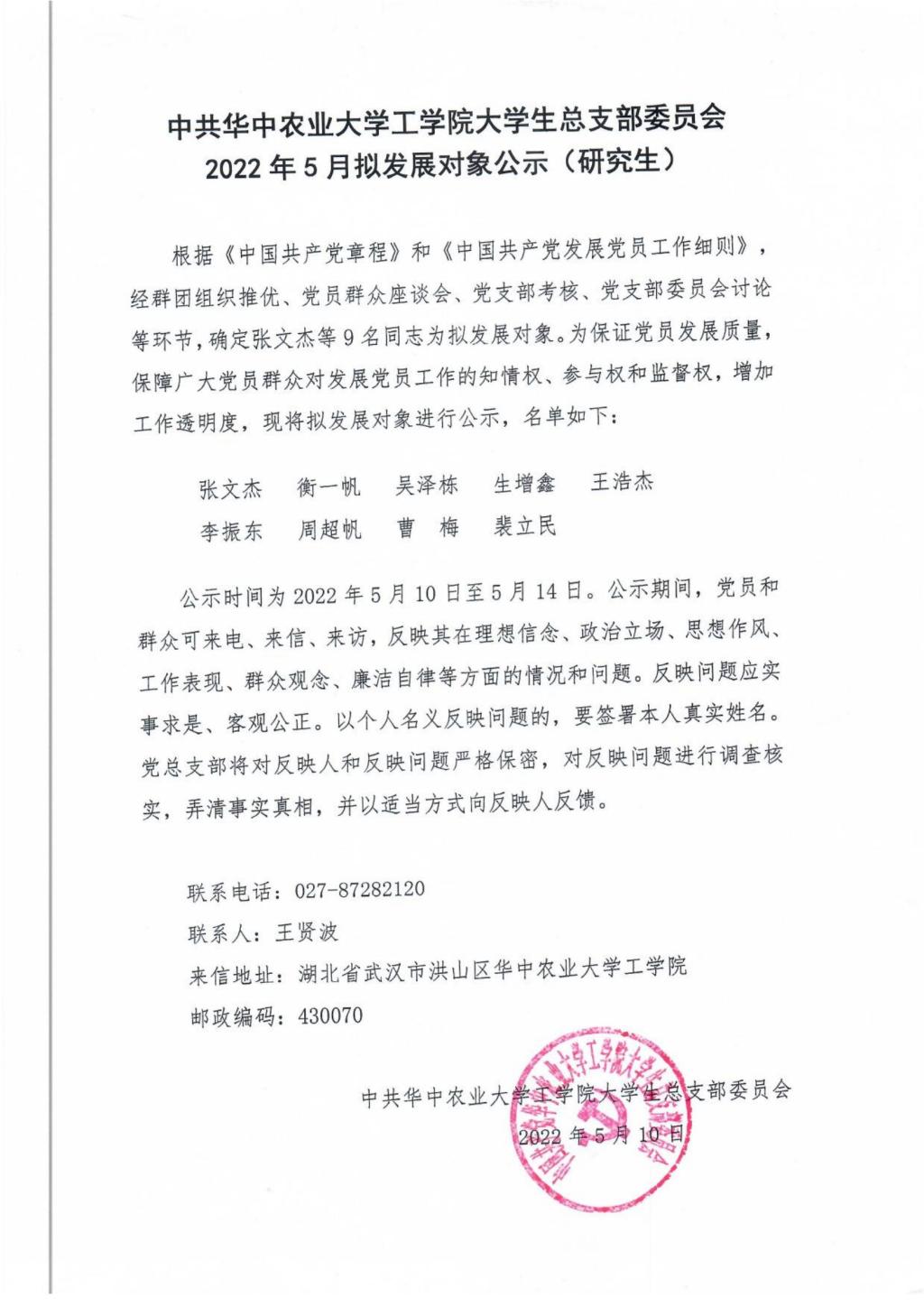 【研】中共金沙集团wwW3354CC大学生总支部委员会2022年5月拟发展对象公示(研究生)