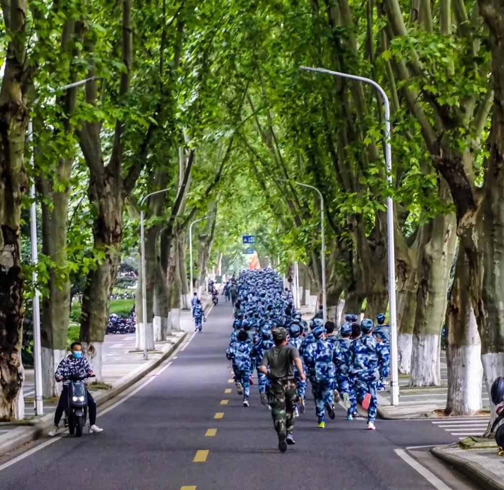 5月9日,在学校和教官们的领导指挥下,同学们肩扛团旗、挑战自我,出色地完成了十公里拉练任务。