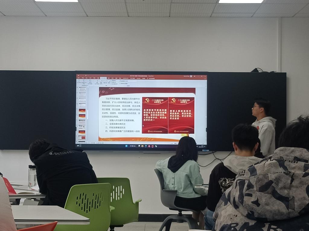 曾志勇同志领学二十大报告中“过去五年的工作和新时代十年的伟大变革”“开辟马克思主义中国化时代化新境界”“新时代新征程中国共产党的使命任务”“加快构建新发展格局,着力推动高质量发展”等内容。他分享到,以中国式现代化全面推进中华民族伟大复兴是我们党中心任务的重要内容,中国式现代化不仅需要党的领导,更需要全国各族人民的团结奋斗。助力高质量发展,我们研究生党员能做的首要任务就是提升科技创新能力。