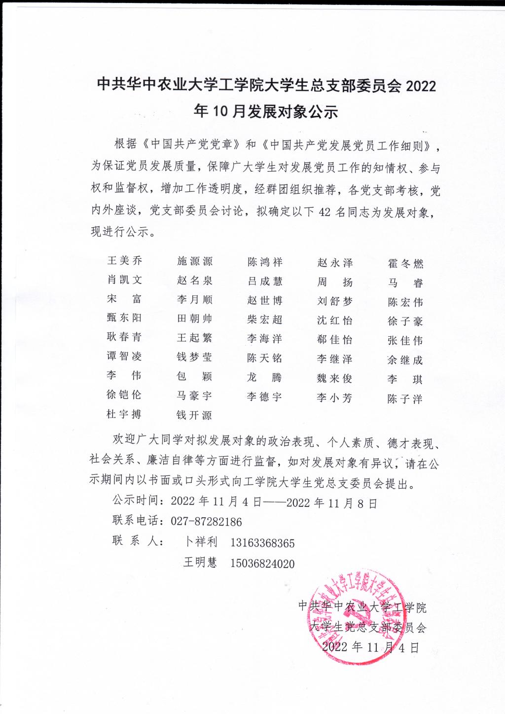 中共金沙集团wwW3354CC大学生总支部委员会2022年10月发展对象公示