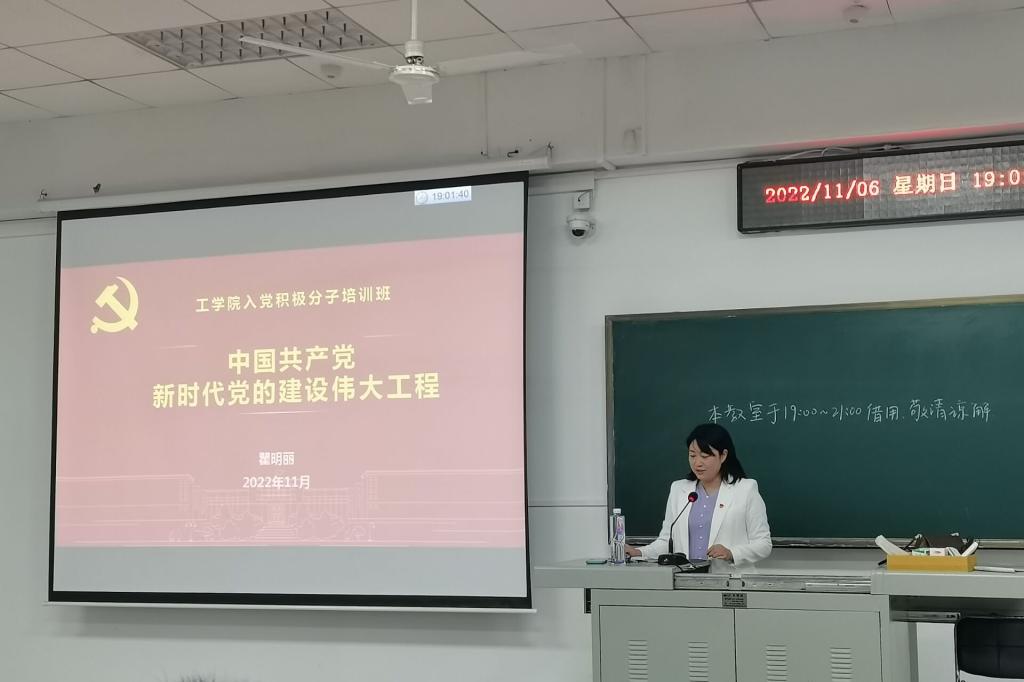 2022年11月6日晚上,金沙集团wwW3354CC第82期入党积极分子第二次线下党课在三教C105进行,学院党委副书记瞿明丽同志为150余名入党积极分子讲授“中国共产党新时代党的建设新的伟大工程”专题党课。本次党课内容围绕党的建设伟大工程形成发展及其重大意义、新时代党的建设的总要求与主要内容、推进党的建设新的伟大工程的实践与启示等三个方面进行。