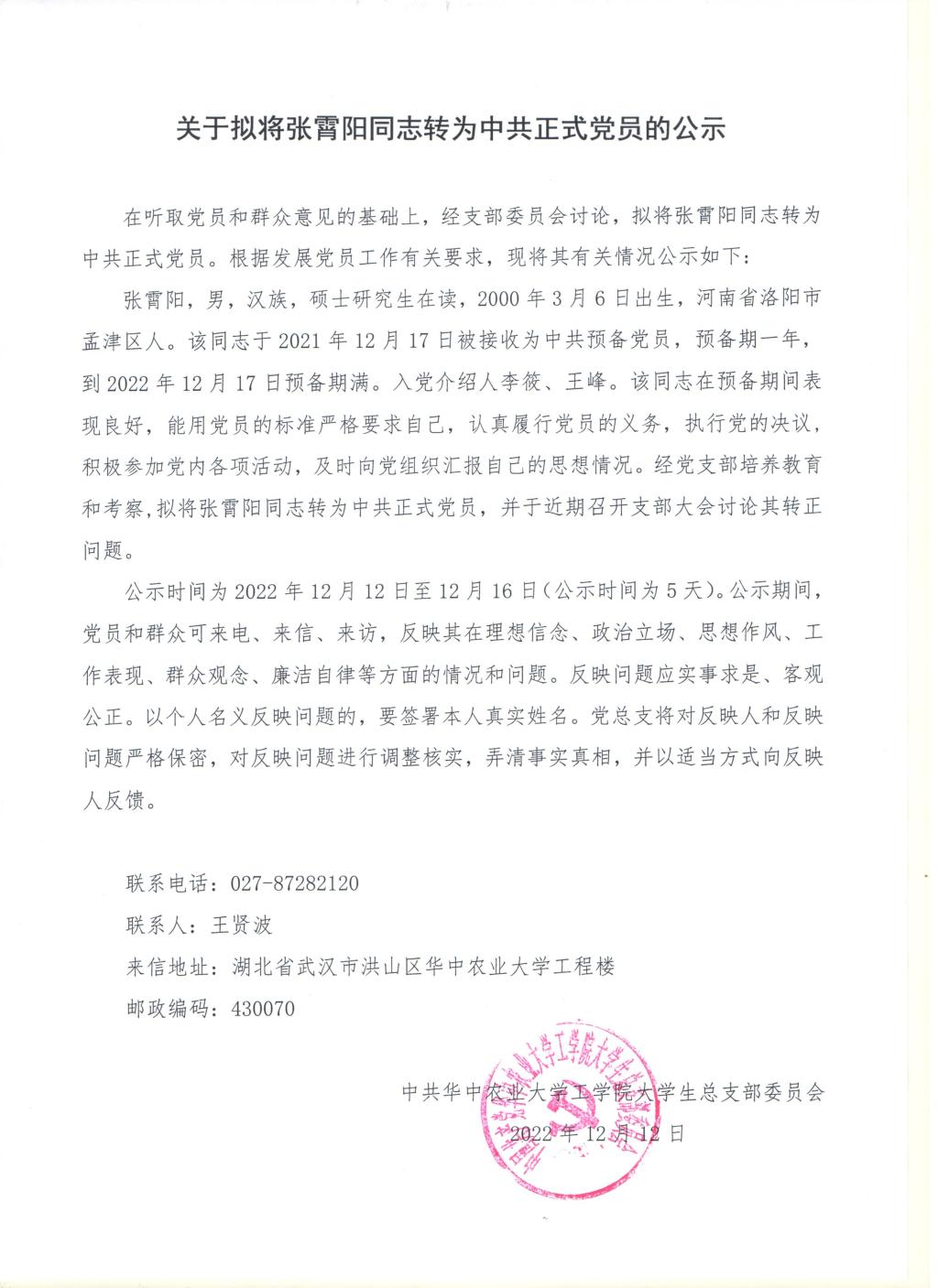【研】关于拟将张霄阳同志转为中共正式党员的公示