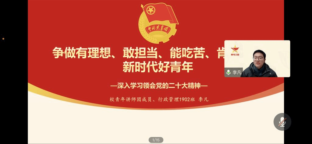 为深入学习贯彻党的二十大精神,引导青年学生坚定理想信念,12月14日晚,金沙集团wwW3354CC开展主题为“争做有理想、敢担当、能吃苦、肯奋斗的新时代好青年”的线上宣讲活动。本次活动面向本科生机械四个团支部,邀请到来自公共管理学院的校二十大精神青年讲师团成员李凡同学进行分享交流,会议由本科生辅导员李龙程主持。