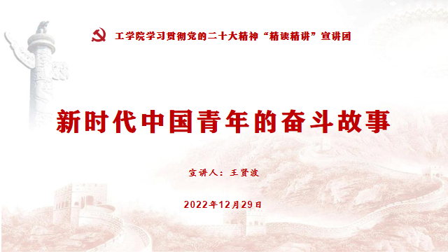 12月29日晚,学院组织研究生入党积极分子学习党的二十大精神,研究生辅导员王贤波以“新时代中国青年的奋斗故事”为题以线上会议的形式进行了主题宣讲,80余名入党积极分子参加学习。