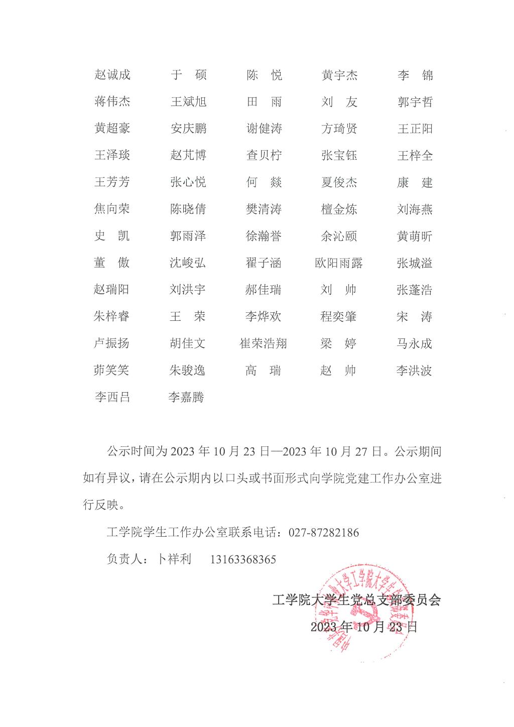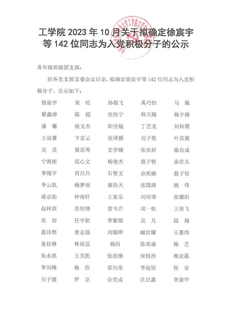 金沙集团wwW3354CC2023年10月关于拟确定徐宸宇等142位同志为入党积极分子的公示