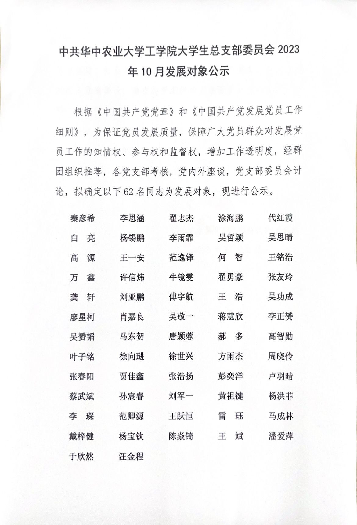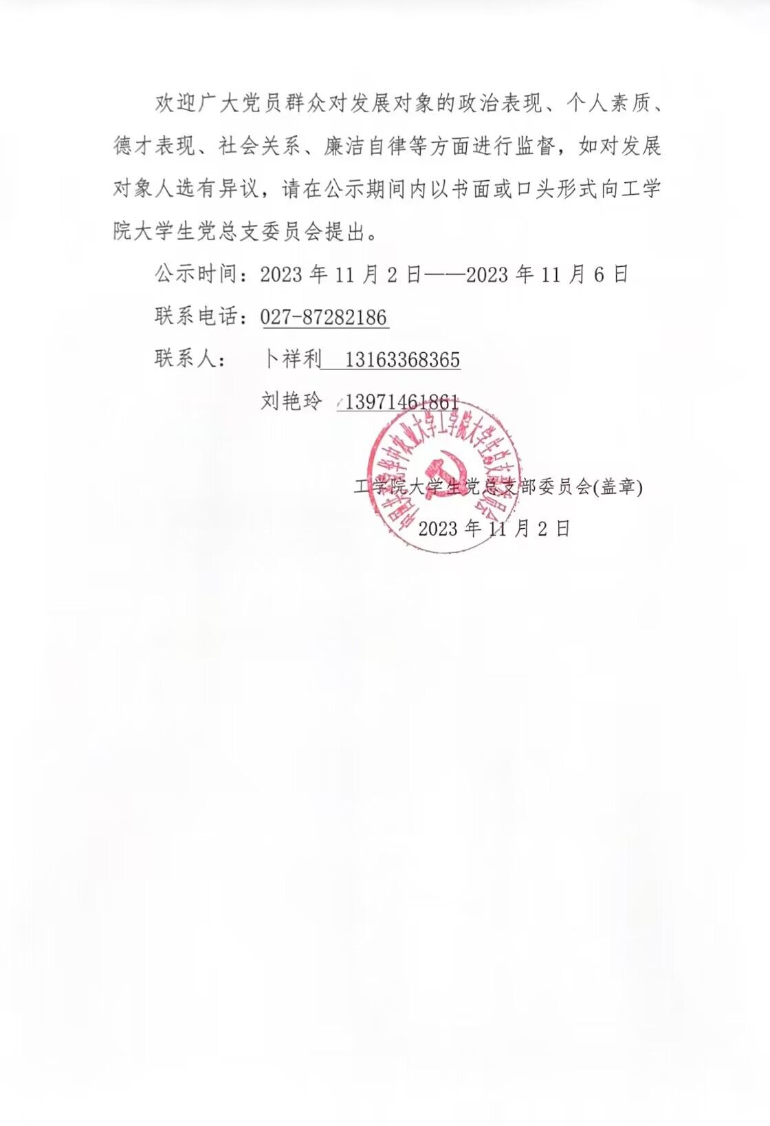 中共金沙集团wwW3354CC大学生总支部委员会2023年10月发展对象公示