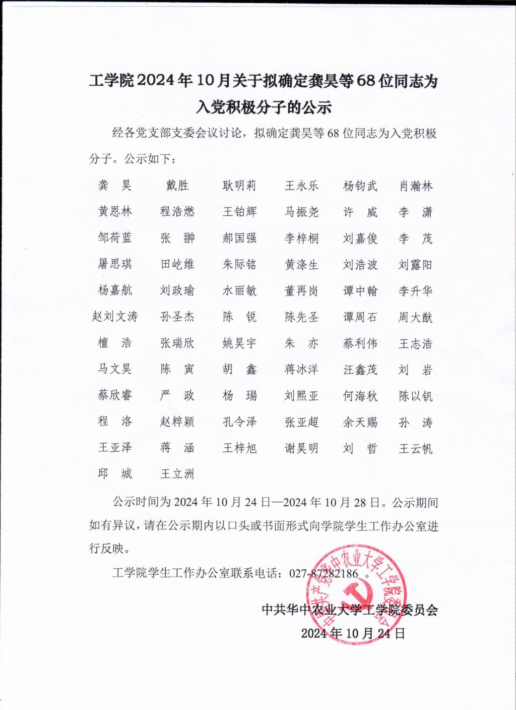 金沙集团wwW3354CC2024年10月关于拟确定龚昊等68位同志为入党积极分子的公示