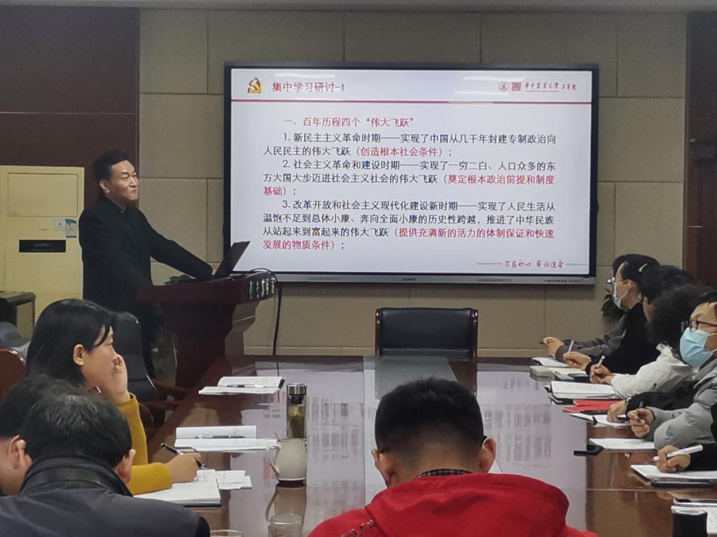 随后,与会人员结合学习内容纷纷畅谈学习体会和心得感悟。学生党员陈永康分享了在学习十九届六中全会会议时的感想,他相信在第二个百年目标的开局之年,在中国共产党的领导之下,我们一定能够建成社会主义现代化强国,实现中华民族伟大复兴。黄英杰老师指出,党的十九届六中全会精神,是对我们党百年奋斗的重大历史成就和经验的总结。“惟愿诸君将振兴中国之责任,置之于自身之肩上”这句话启迪我们发扬孙中山先生等辛亥革命先驱的伟大精神,要从自身出发,从小事做起,立足工作岗位做到办实事、解难事、做好事,提升广大师生的获得感、参与感、幸福感。周洪亮老师谈到,作为一名党员,首先要深入学、系统学,读原文、悟原理,全面领会十九届六中全会的丰富内涵和核心要义。第二,要主动思考,要深入思考全会精神中所蕴含的世界观方法论,从党的百年奋斗历史中汲取力量,进一步提升履职能力。第三,要立足岗位,勇于担当,真抓实干,以实际行动迎接党的二十大的召开,为实现第二个百年奋斗目标贡献自己的力量。