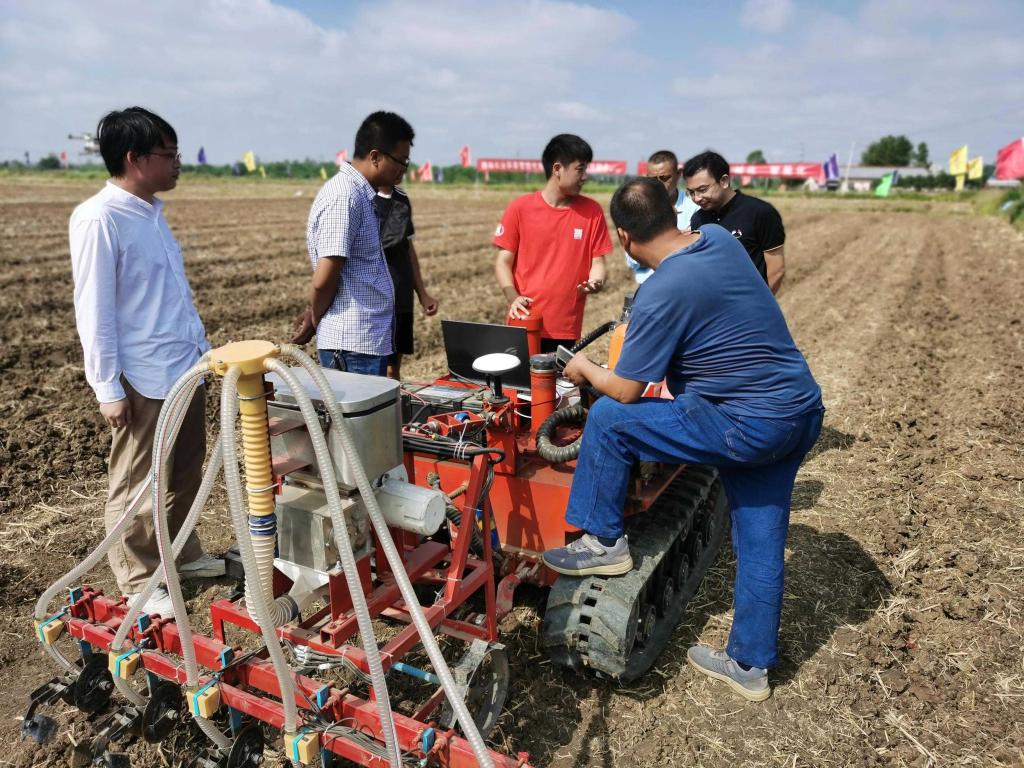 观摩会现场,金沙集团wwW3354CC的几名研究生手拿键盘,操作一台大型无人油菜直播机,走线平直、速度均衡,易转弯、效率高,令在场的乡亲们齐声叫好。