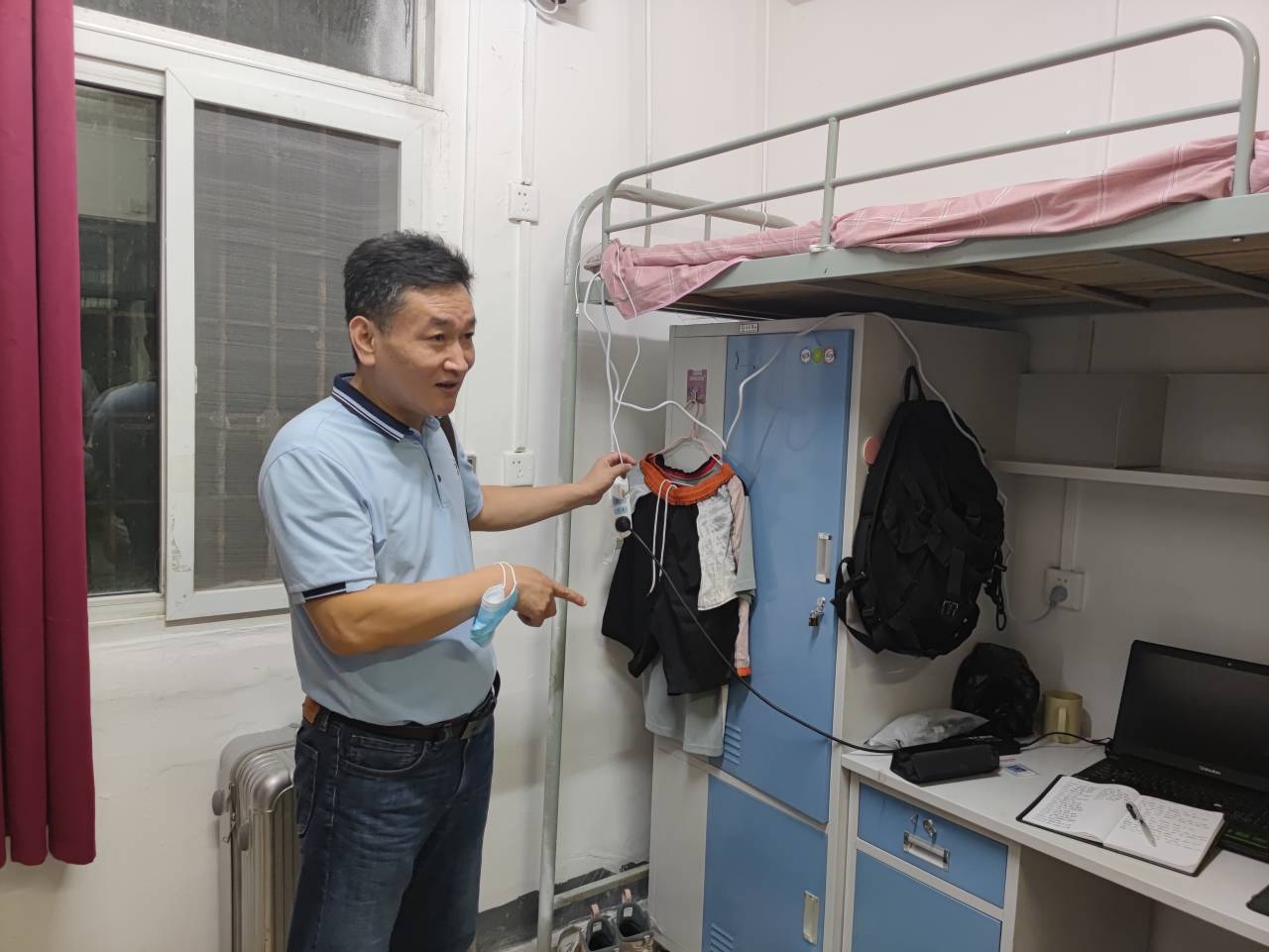 “同学们好,这是我们学院的段宏兵老师和刘洁老师,我们一起来看看大家。”在博园10栋一楼宿舍,院党委书记明庭庆一走进新生宿舍就与同学们主动打招呼交流。明庭庆一行与新生亲切交流,询问同学们的学习情况和家庭情况,并且告诉同学们有困难和需求一定要及时告诉导师或辅导员。看到学生床上挂着插排,明书记温馨提示同学们,要注意宿舍的用电安全,要做到人走电断,并且要保持寝室的清洁卫生,他还建议同学们要与室友和谐相处、互帮互助,营造温馨的寝室关系。走访过程中,有同学提到住宿条件比较简陋,明书记耐心向同学们解释说明了相关情况。他谈到,学校研究生规模快速增加,宿舍资源紧张,学校也在积极行动,努力改善同学们的住宿条件,希望同学们能够克服艰苦条件,将更多精力放在科学研究上,努力让研究生生活更加充实丰富。交流过程中,明书记多次向同学们谈到,导师们对同学们满怀期待和信心,同学们要学会拼搏、奋斗和坚持,勇敢战胜科研道路上的种种困难,做到有始有终,相信同学们都能不忘入学的初心,取得好成绩。
