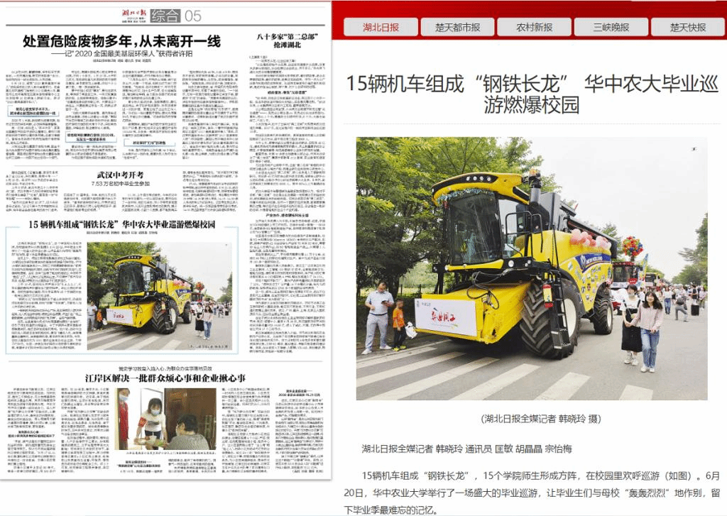 15辆机车组成“钢铁长龙”,15个学院师生形成方阵,在校园里欢呼巡游(如图)。6月20日,华中农业大学举行了一场盛大的毕业巡游,让毕业生们与母校“轰轰烈烈”地作别,留下毕业季最难忘的记忆。