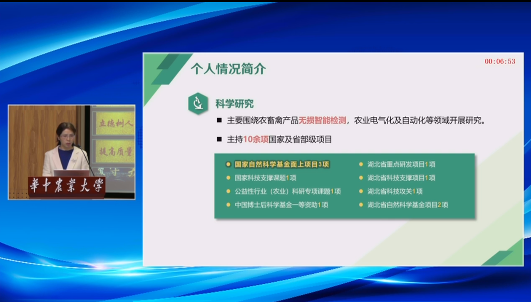 王巧华教授长期工作在教学一线,曾荣获湖北省大学生“创青春”创业大赛金奖指导教师、华中农业大学教学质量一等奖;长期从事农畜禽产品无损智能检测、农业电气化及自动化等领域研究工作,曾获第三届中国蛋品加工业十大杰出人物、湖北省科技进步一等奖、全国商业科学技术进步三等奖。主持了国家自然科学基金、国家科技支撑计划课题、省自然科学基金等国家和省市项目10余项。以第一完成人授权发明专利20余项。以第一作者和通讯作者在国内外学术期刊上发表SCI/EI检索的科技论文50余篇。主编蛋品专著1部。以第一完成人完成科技成果第三方评价2项。主持制订有关蛋品检测的湖北省地方标准2个。