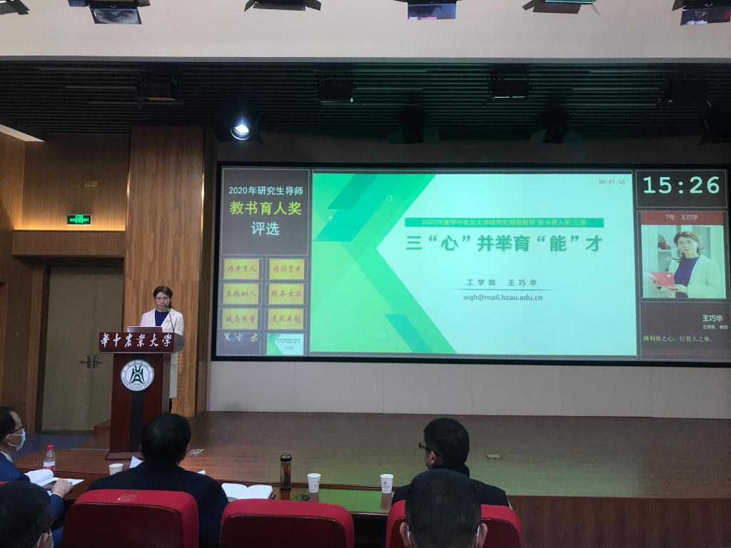 2021年1月12日下午,我校2020年研究生导师“教书育人奖”评选会在农业微生物国家重点实验室B座1楼报告厅举行,来自各学院的14名研究生导师分享了他们立德树人、潜心育才的理念、成效与体悟。经学院推荐、候选人现场汇报展示、评委无记名投票等环节,王巧华等10位教师获研究生指导教师“教书育人奖”荣誉称号。
