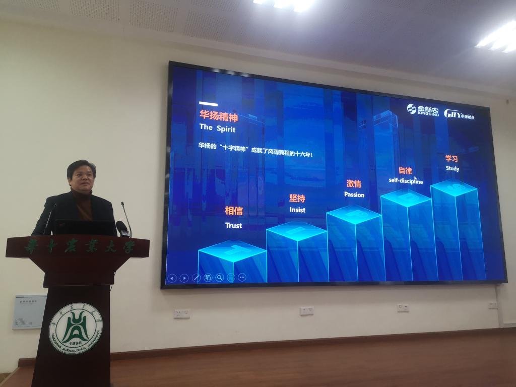 随后,武汉华扬动物保健集团董事长张金林回顾了读大学时的青春故事和自己的创业历程,以此激励同学们努力学习,学好专业知识,提升综合能力,争取为国家和社会做出更大贡献。武汉励耕果园机械有限公司总经理乔安国讲述了自己对“工匠精神”的理解,勉励同学们以工匠精神铸造时代品质。