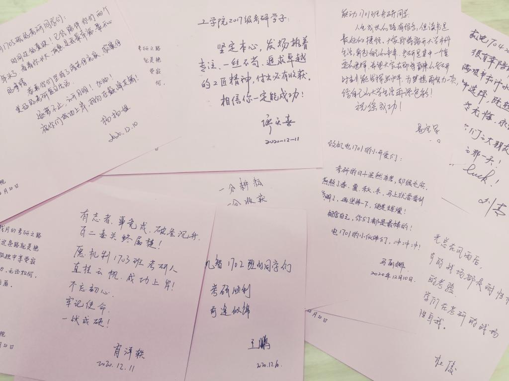 “人生成长的路有很多,但读书是最好的捷径。希望大家在即将到来的考研时刻能发挥出水平,为梦想再努力一次,给自己大学生活再添色彩!”机制1705班班主任杨扬在考研动员会上说道。为了缓解学生考前压力,以最好的状态迎接挑战并且做到诚信应考,杨扬老师在考前半个月时特意抽出时间为班内考研同学召开了考研动员会。金沙集团wwW3354CC15个毕业班级的班主任纷纷亲笔书信并送给班级考研学生,为其加油打气。老师们的声声期许,仿佛冬日的一缕暖阳,温暖着学子们的心田。金沙集团wwW3354CC院长廖庆喜寄语全院考研学子:“坚定本心,发扬执着专注、一丝不苟、追求卓越的工匠精神,付出必有收获,相信你一定能成功!”