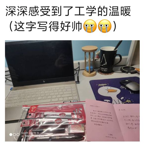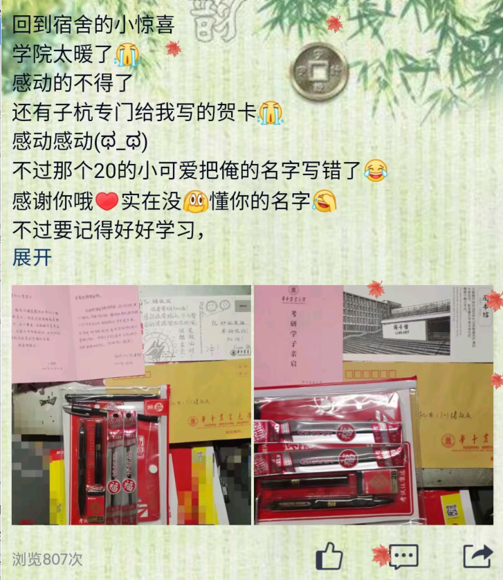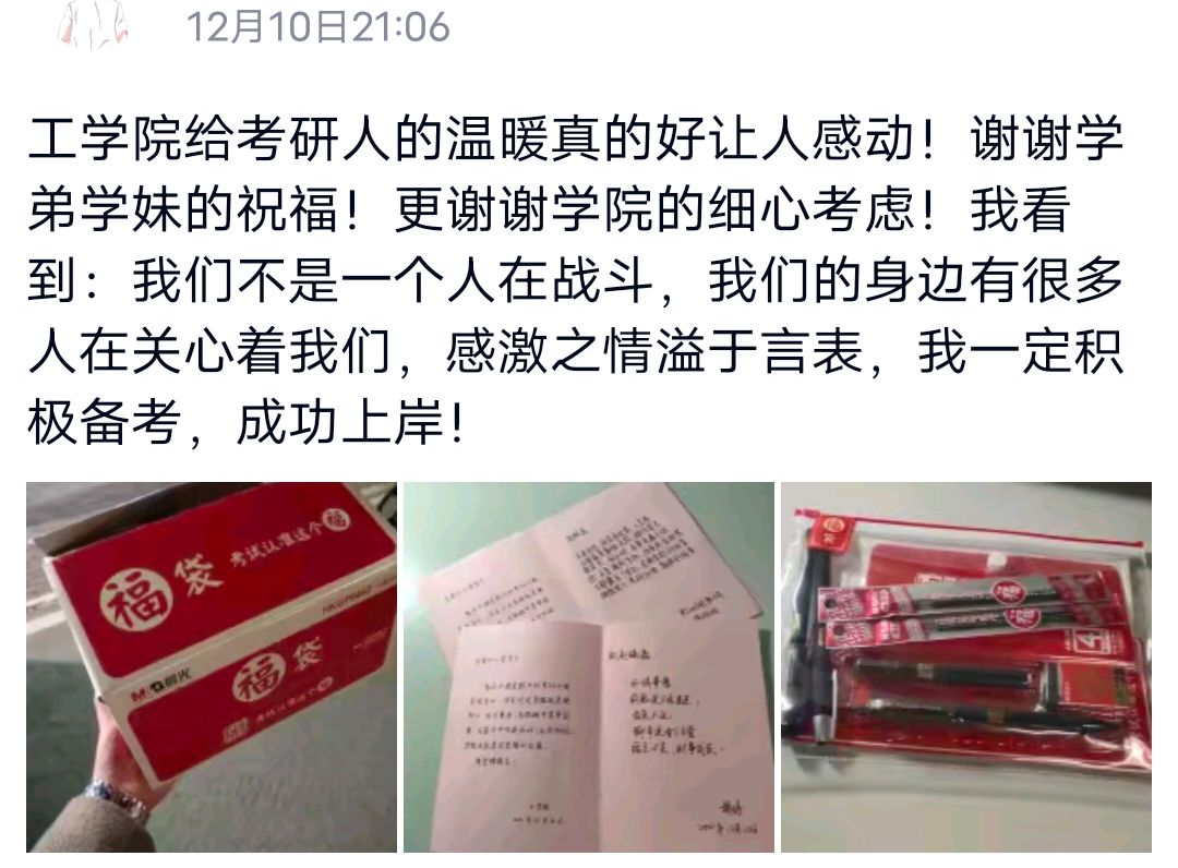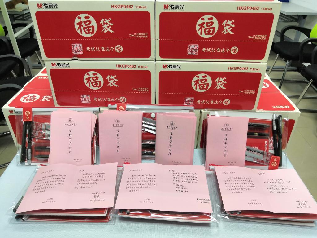 学院高度重视应届毕业生的备考工作,毕业班班主任通过“面对面”“键对键”等各种方式表达对考研学子的关心与慰问;论文指导教师、辅导员更是经常与考研学子交心谈心,帮助大家进行心理调适和心理疏导,鼓励大家在考研冲刺的关键阶段积极准备、调整心态、坚定信心。今年,学院统一为260名考研学子购买考研“福袋”,其中包含签字笔和笔芯各两支、涂卡笔一支、橡皮一块、尺子一套,保证学生考试工具不遗漏。“看着老师亲笔为我书写的祝福,真是感动满满”“感觉学院太有温度了”学子们纷纷感慨。