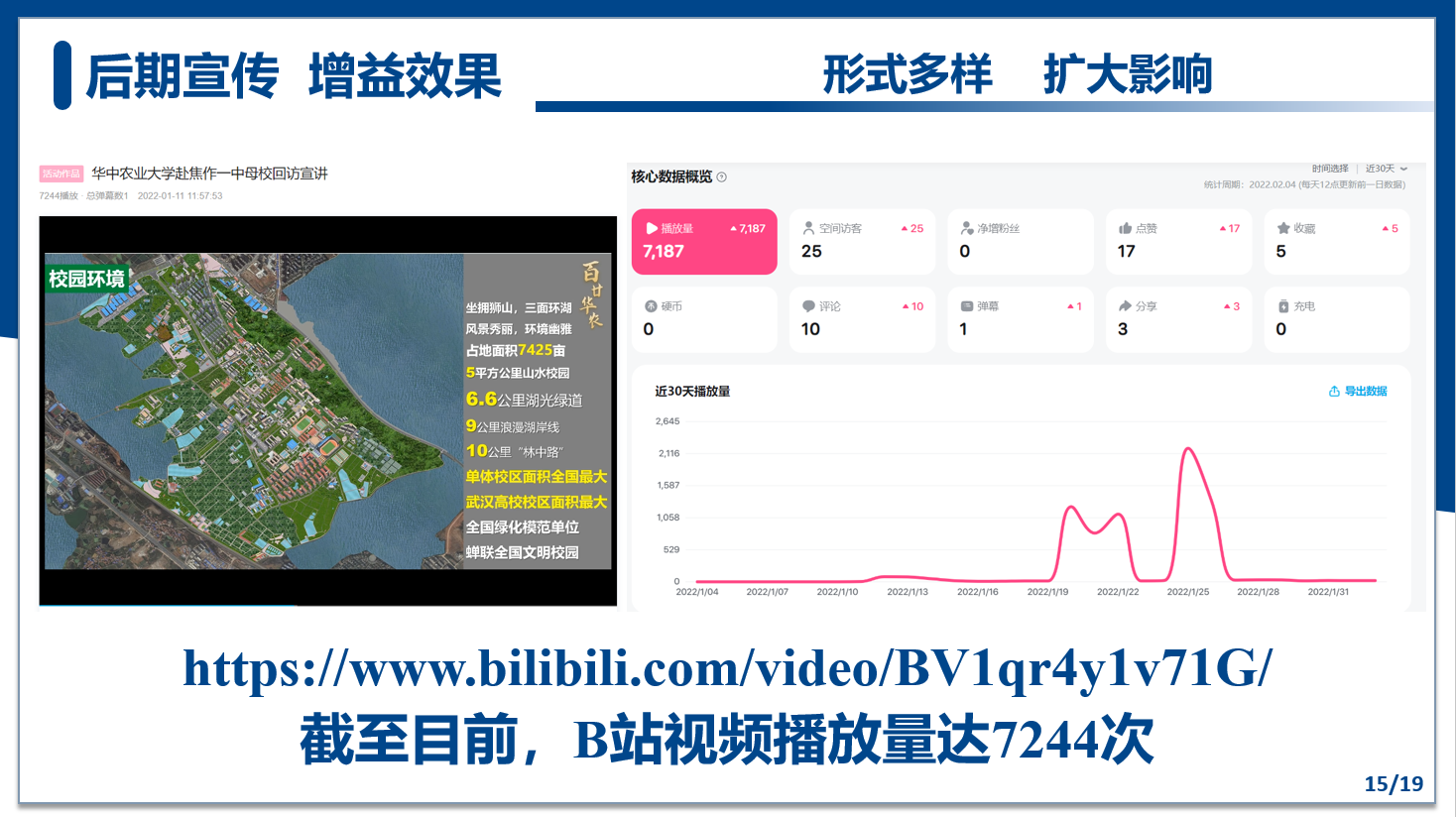 “赴河南省队焦作市第一中学回访社会实践团”由金沙集团wwW3354CC机械化1802班李辰洋、机械类2001班赵永泽和生命科学技术学院2021级任育昕组成,李辰洋担任队长。在华农学习生活近4年的李辰洋全方位、系统性介绍华农的综合情况,包括办学历史、校园环境、办学规模、综合排名、科技实力、培养理念、校园文化、招生政策、报考指南、问题答疑等方面。他谈到:“华农的人才培养体系非常棒,为我提供了许许多多科学研究、学生工作、志愿服务的平台,使我最终能够直博天津大学。”通过他的介绍,让一中学子对华农的育人体系有了更深入的理解。在后期宣传方面,团队成员自制视频,并将宣传视频发布至B站,视频播放量达7244次,同时将宣传内容发布QQ空间,热度突破2.6万,获7269个点赞。