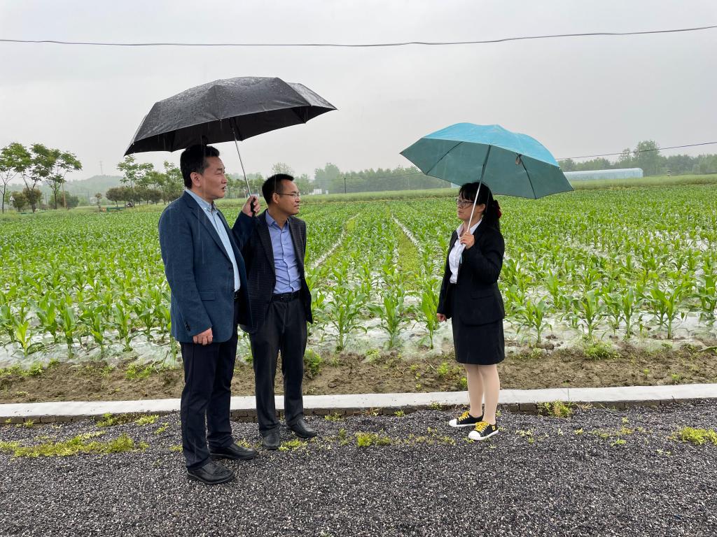 在崇阳县吴城村,明庭庆一行冒雨深入田间查看玉米、油菜长势情况,与隽青农场负责人就玉米机械化移栽、油菜全程机械化技术进行深入交流,并就玉米品牌化销售和菜籽油工业化生产提出相应的意见和建议。