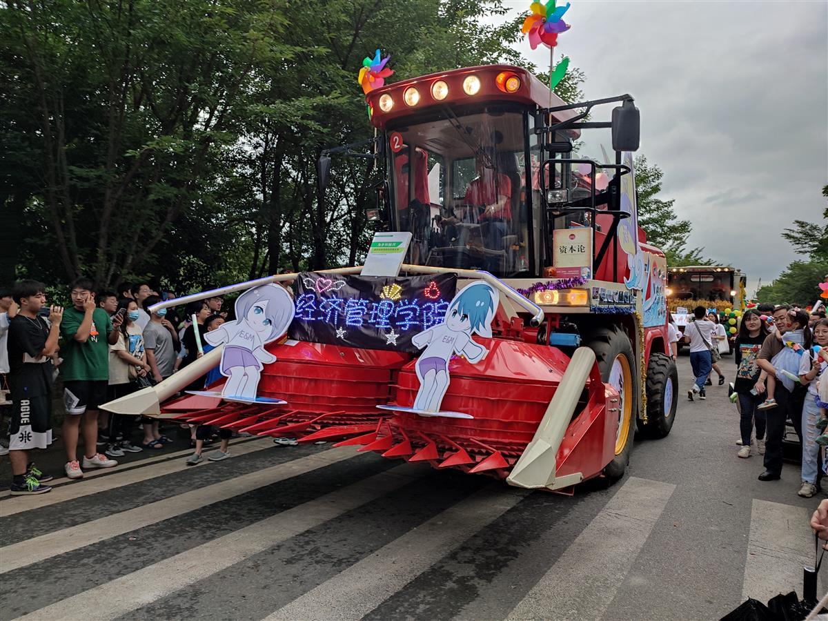 17辆经过精心装扮的现代农机装备,组成了“钢铁长龙”,带着丰富的寓意和美好的祝福,从工科基地出发,在校园里的主干道上徐徐前行,驶往狮子山广场喷泉处。各学院师生形成方阵,一起欢呼巡游。