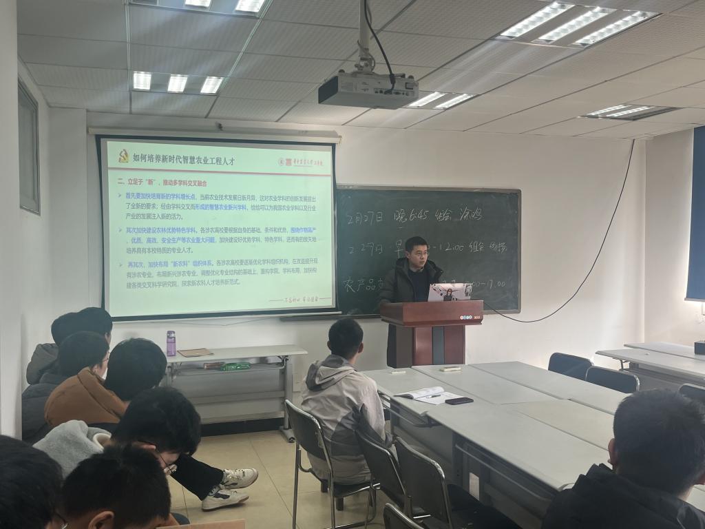 2月27日,学院 “精读精讲”宣讲团成员黄成龙老师以“坚持党建引领下的三全育人,培养新时代智慧农业工程人才”为题向农产品智能检测及数字化装备研究生党支部的同学们讲解了科教兴国和人才强国战略下人才培养的任务与目标、农业农村现代化的重要性。他结合智慧农业技术的应用场景谈到,农业农村现代化是建设农业强国和现代化国家的内在要求和必要条件,人工智能、大数据、区块链等新一代数字技术快速发展也为乡村振兴提供了强有力的科技支撑,作为农业院校的学子更要关注国家和社会需求,深耕农业技术,努力成长为新时代智慧农业工程人才。他还对学校深入推进三全育人、构建协同育人体系等相关工作进行了分享。宋亚星同志在学习后谈到,在今后的学习中,要努力朝着智慧农业方向深入发展,不负国家和学校的培养期待,争取成为新时代智慧农业工程技术人才。